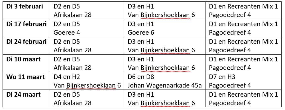 We kunnen gelukkig regelmatig terecht voor onze volleybaltrainingen in de sportzalen van het Globe College. Helaas is daar niet altijd plek voor ons. Daarom zie je hieronder op welke data voor de desbetreffende teams vervangende trainingsruimte is geregeld: